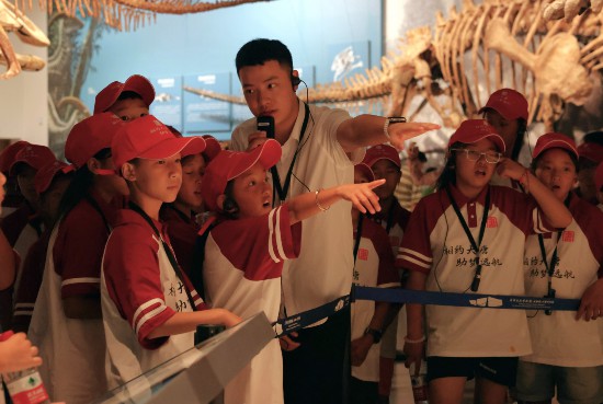 8月18日,高达数层楼的合川马门溪龙骨架化石让孩子们惊讶不已。